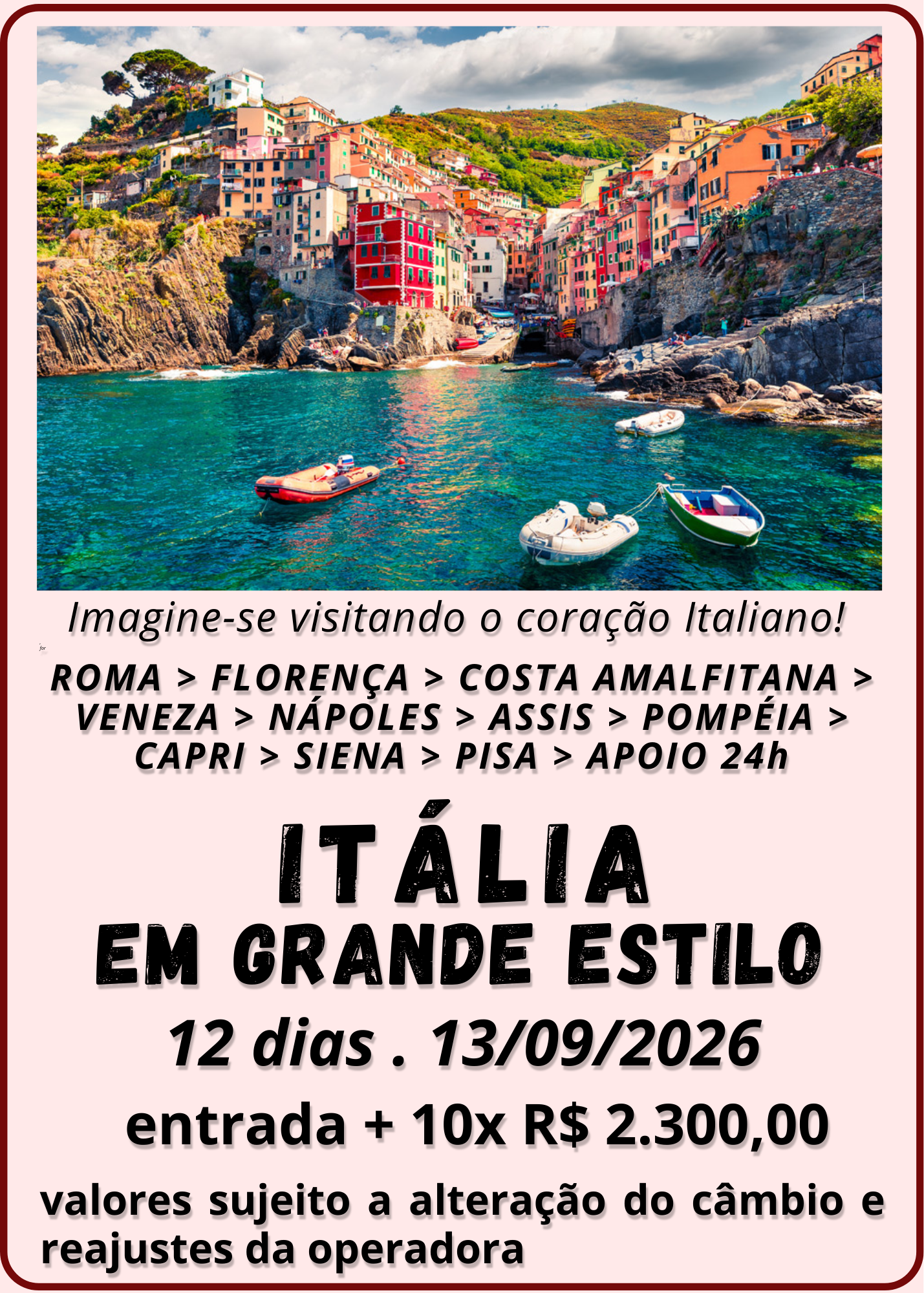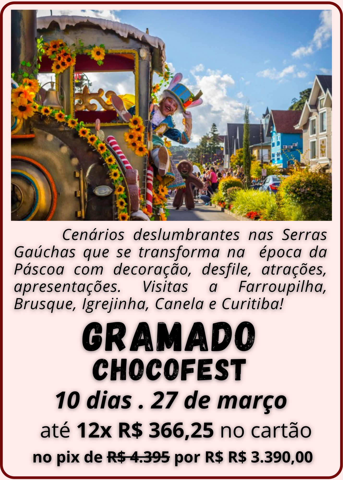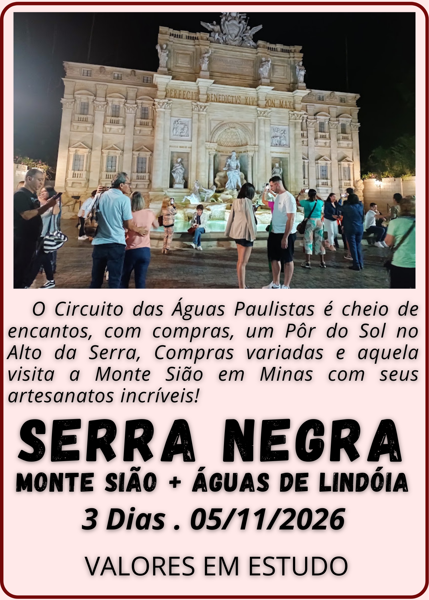 Em geral nossos pacotes de viagem incluem transporte turístico, hospedagem, café da manhã. Cada destino pode ter serviços específicos, confira os detalhes na página de cada pacote ou se preferir entre em contato com nosso time.