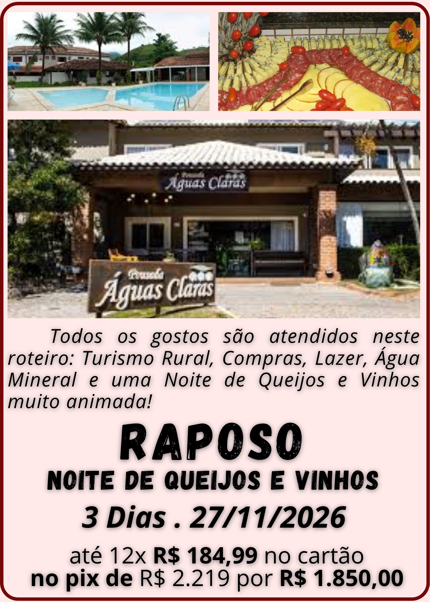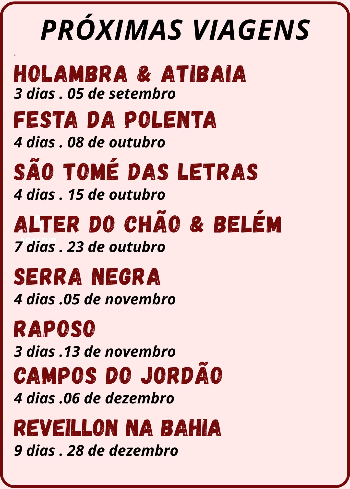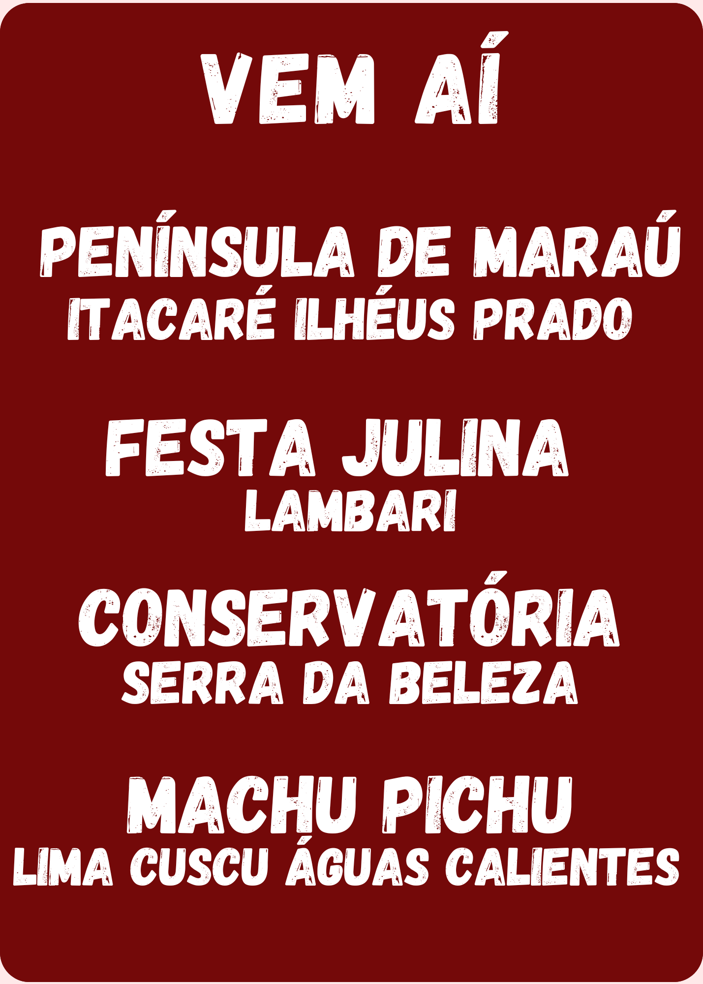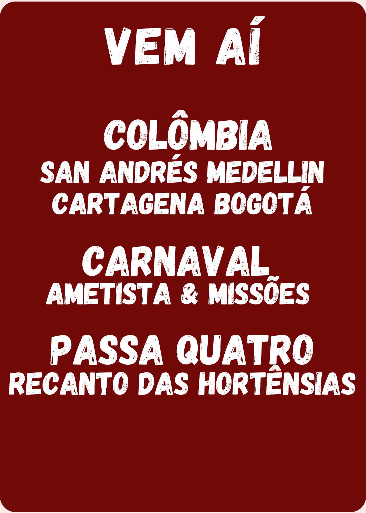 Em geral nossos pacotes de viagem incluem transporte turístico, hospedagem, café da manhã. Cada destino pode ter serviços específicos, confira os detalhes na página de cada pacote ou se preferir entre em contato com nosso time.